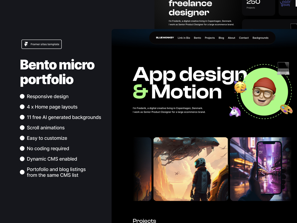 Introducing the Bento Micro Portfolio, a Framer template designed to effortlessly showcase your work with style and sophistication. Inspired by the popular bento-style layout made famous by Apple, this template offers a visually engaging and highly responsive design, ensuring a seamless experience across all devices.